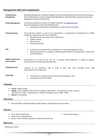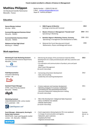 This document summarizes a French student enrolled in a Master of Science in Management degree program. It includes his contact information, education history including a master's from Euromed Business School and bachelor's from Euromed Bachelor Business School. It also outlines work experience in marketing, project management, and event management. Key skills listed include global business management, project management, entrepreneurship, sales, and multi-tasking. The student is fluent in English and has intermediate Spanish skills.