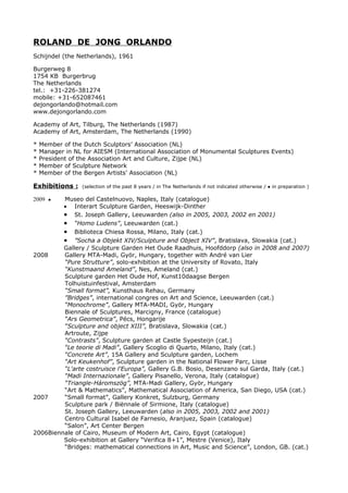 Roland de Jong Orlando is a Dutch sculptor born in 1961. He studied at art academies in Tilburg and Amsterdam and is a member of several sculptors' associations. Over his career, he has exhibited widely across Europe and participated in international sculpture symposiums working in various materials. He has also completed several public art commissions for Dutch municipalities, creating both monumental and interactive sculptures. His works are included in the collections of several cities and institutions.