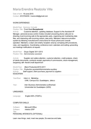 Maria Erendira Realzola Villa has over 10 years of experience in administrative and customer service roles. She has held positions as a front desk receptionist, administrative assistant, and production assistant. Her responsibilities have included customer service, data entry, office administration, and supplier management. Currently, she is interning in marketing at the University of Guadalajara campus in Sur, Jalisco while also pursuing an unfinished degree in business administration.