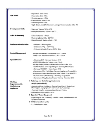 Amr El-Shamy is applying for a job and provides his resume. He has a B.Sc. in Biomedical Engineering from Helwan University in Egypt. He has over 15 years of experience working in sales and marketing roles for various medical equipment companies in Egypt, Saudi Arabia, and Kuwait. This includes experience with radiology equipment like x-rays, CTs, ultrasound and PACS/RIS systems. He also lists technical skills in areas like software, computer maintenance, and languages. Currently he is a Sales Manager in Kuwait focusing on products from Carestream, Samsung Medison and Esaote.