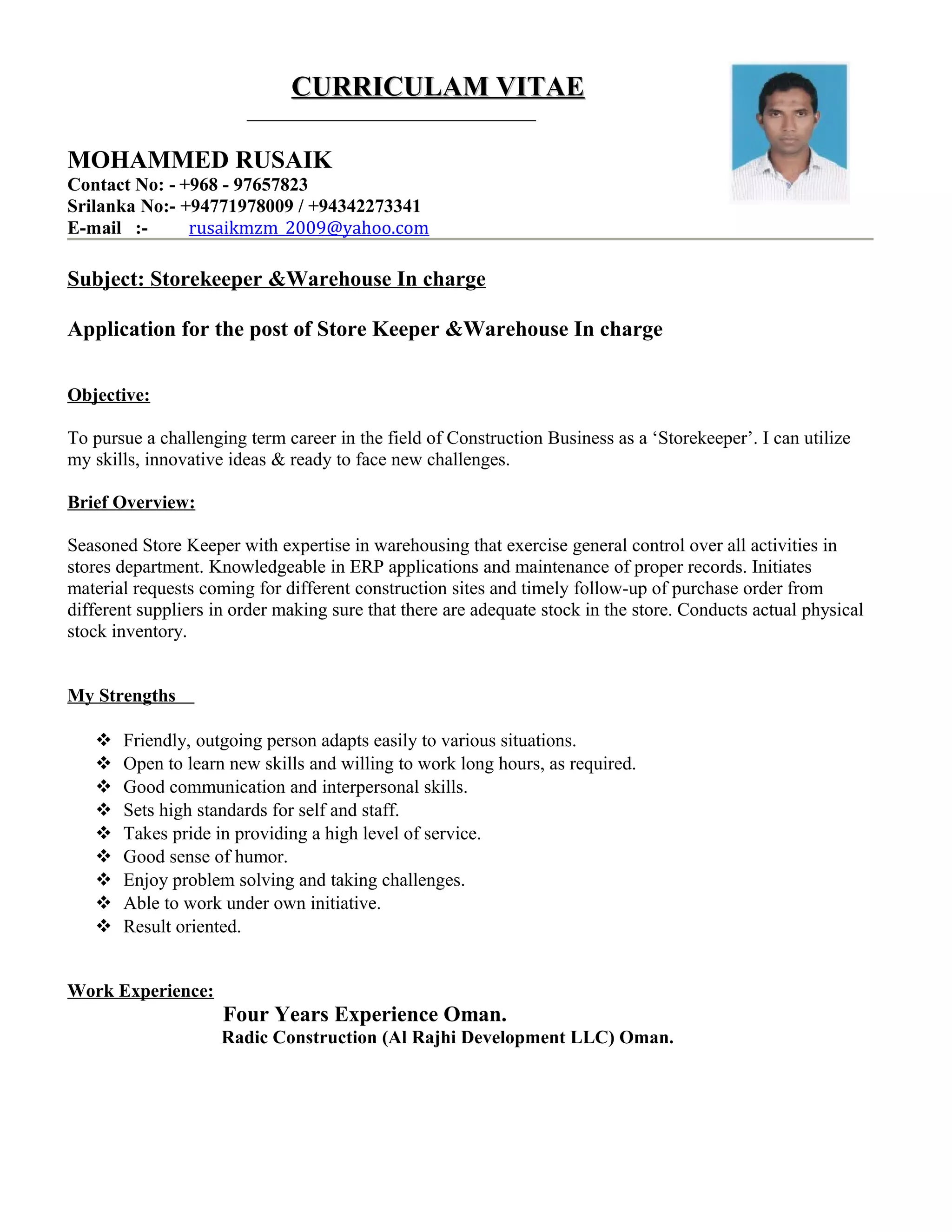 Mohammed Rusaik is applying for the position of Storekeeper & Warehouse In Charge. He has over 4 years of experience in a similar role in Oman. His responsibilities included receiving and checking materials, issuing materials to workers, maintaining records and files, generating reports, and supervising the storage and movement of materials. He has expertise in ERP systems and proficiency in Microsoft Office. Rusaik is seeking a challenging long-term career where he can utilize his skills and experience as a Storekeeper.