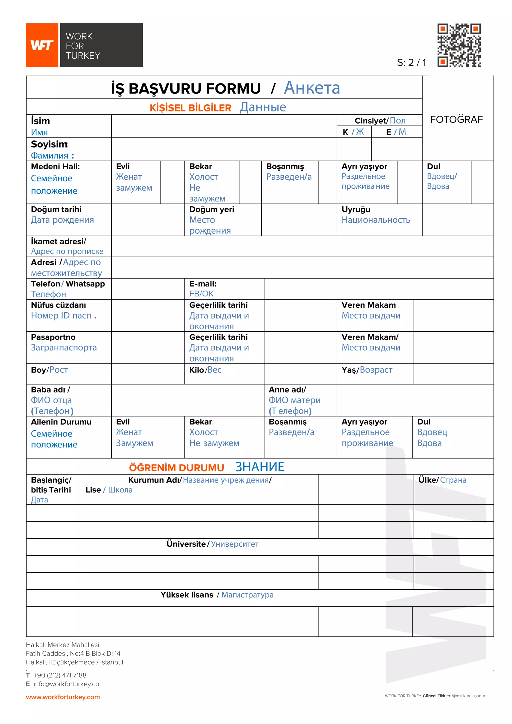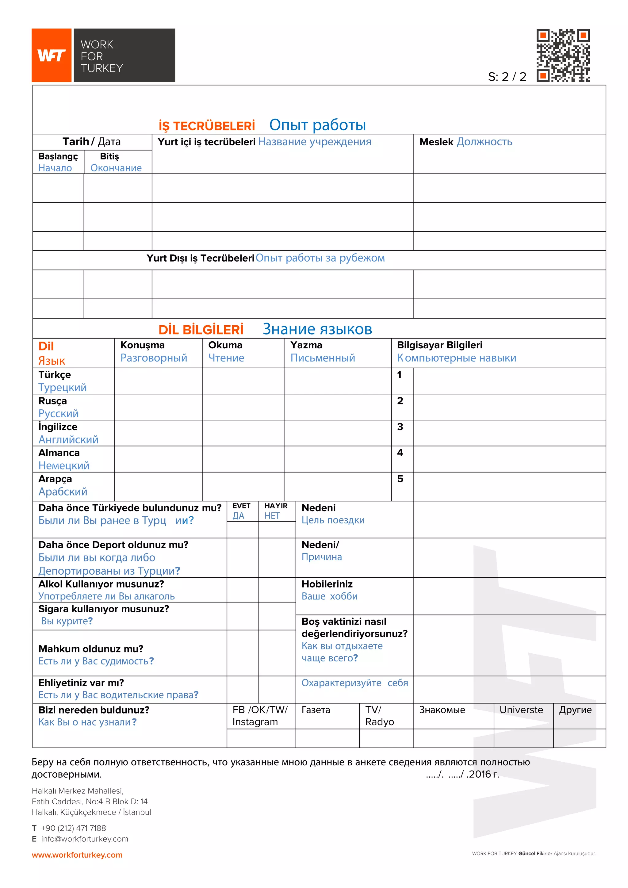 Документ представляет собой анкету для подачи заявлений о работе в агенции "Work for Turkey". Он включает в себя различные поля для личной информации, профессионального опыта и навыков кандидата, а также вопросы о предыдущем пребывании в Турции и личных предпочтениях. Анкета завершается подтверждением достоверности предоставленных данных.