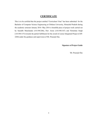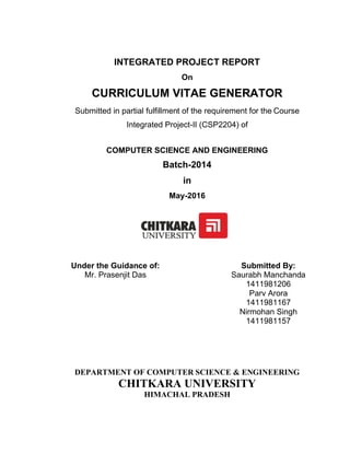 The document describes an integrated project report on developing a curriculum vitae generator application, including details about the methodology used, such as the data flow diagram, class hierarchy, software and hardware requirements, database connectivity, and working of the application. It was submitted by 3 students in partial fulfillment of their course requirements and was guided by Mr. Prasenjit Das.