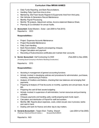 The document is a curriculum vitae for Imran Ahmed, an Assistant Manager of Accounts based in the UAE with over 11 years of experience in cost management and accounting. It outlines his educational background, including qualifications in cost and management accounting and membership in accounting associations. It also details his professional experience in accounting roles of increasing responsibility with construction, manufacturing, and trading companies in Pakistan, the UAE, and Saudi Arabia. His roles involved responsibilities such as financial reporting, budgeting, payroll processing, auditing, and system experience including various accounting software.