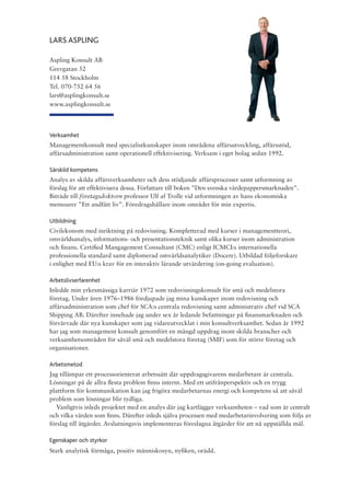 affärsadministration samt operationell effektivisering. Verksam i eget bolag sedan 1992.
