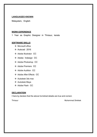 Muhammed Shefeek is providing his resume. He was born on January 6, 1991 in Thrissur, Kerala, India and is currently single. He has a diploma in Multimedia and Animation from Aptech in 2014 and a B.Com from Calicut University in 2011. He has over 1 year of experience as a Graphic Designer in Thrissur, Kerala. He is proficient in software like Adobe Photoshop, Illustrator, InDesign, Premiere, and Microsoft Office.