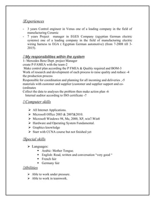 Mahmoud Ismail Mohamed Al_sisy is an Egyptian national born in 1976 who has over 10 years of experience in manufacturing roles. He received a B.Sc. in communication and electrical engineering in 2003 and holds several quality and process auditor certificates. His most recent role was as a Project Manager at EGES Company from 2008 to 2015 overseeing wiring harness production for Mercedes Benz. He has strong computer skills and is fluent in Arabic and English.