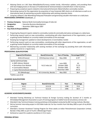 Maneesh Sharma has over 9 years of experience in commodities and currency markets research, price risk management, and treasury management. He currently works as a Manager of Research at Religare Commodities, where he tracks prices, prepares reports, and provides calls on metals, energy, agriculture, and currencies. Previously, he held roles in risk management, treasury, and advisory at other companies. He has an MBA in finance and qualifications in commodities, capital markets, and derivatives.
