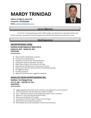 Mardy Trinidad is seeking a challenging position that offers professional development. He has over 5 years of experience in retail, customer service, and food service roles in the Philippines. His experience includes working as a sales clerk, cashier, and service crew. He has a Associate in Hotel and Restaurant Management degree and seeks to further his career with a new opportunity in Dubai.