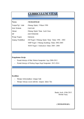 Curriculum vitae ini milik Muhammad, lahir di Matang Sijeuk pada 9 Maret 1990, dengan pendidikan formal dari SD hingga MAN di Aceh. Ia memiliki pengalaman kerja di mini market dan warkop serta keahlian dalam komunikasi dan kerja tim. Dokumen ditandatangani di Banda Aceh pada 4 Mei 2015.