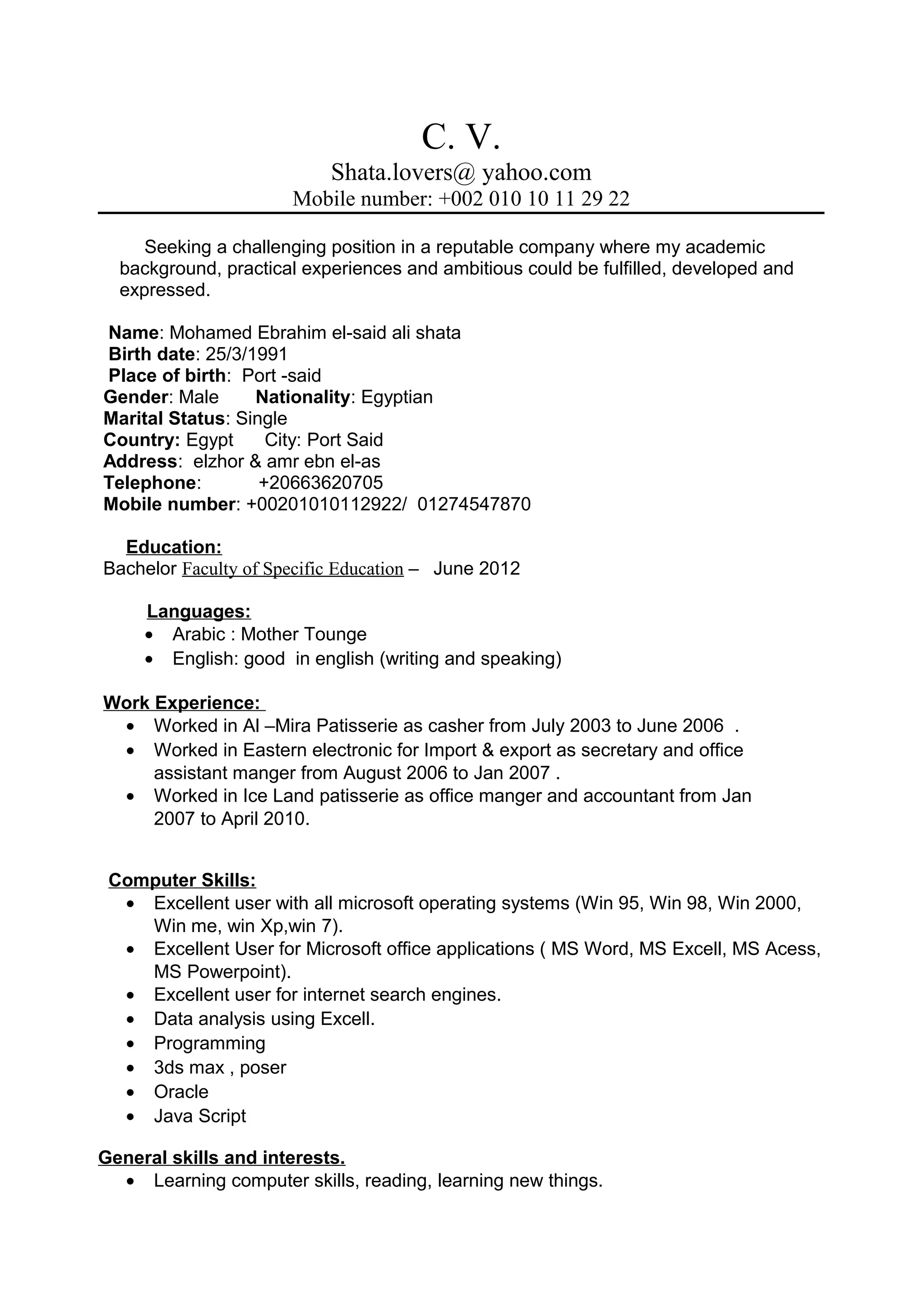 Mohamed Ebrahim el-said ali shata is seeking a challenging position in a reputable company. He has a Bachelor's degree in Faculty of Specific Education from June 2012. He has work experience as a casher, secretary, office assistant manager, and office manager/accountant from 2003 to 2010. Mohamed has excellent computer skills including Microsoft operating systems, applications, internet search engines, data analysis in Excel, programming, 3Ds Max, Poser, Oracle, and JavaScript.