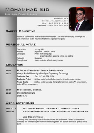 Mohammad Eid seeks a position utilizing his electrical engineering skills. He has a B.Sc. in electrical power engineering and over 5 years of experience in lighting design, project engineering, and site engineering. His objective is to grow in a professional environment while contributing to organizational goals.