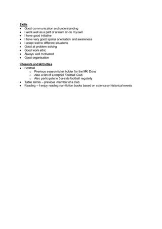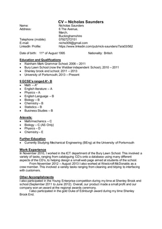 Nicholas Saunders is a British mechanical engineering student born in 1995 in Buckinghamshire. He attended several schools in Buckinghamshire including Rainham Mark Grammar School and Shenley Brook End School. He earned 9 GCSEs ranging from A* to B and A-Levels in math, biology, physics, and chemistry. Currently, he attends the University of Portsmouth studying mechanical engineering. He has work experience in an ICT department and at McDonalds. His accomplishments include participating in Young Enterprise and earning the Duke of Edinburgh Gold Award. His skills include communication, teamwork, initiative, problem solving, and organization. His interests are football, table tennis, and reading non-fiction.