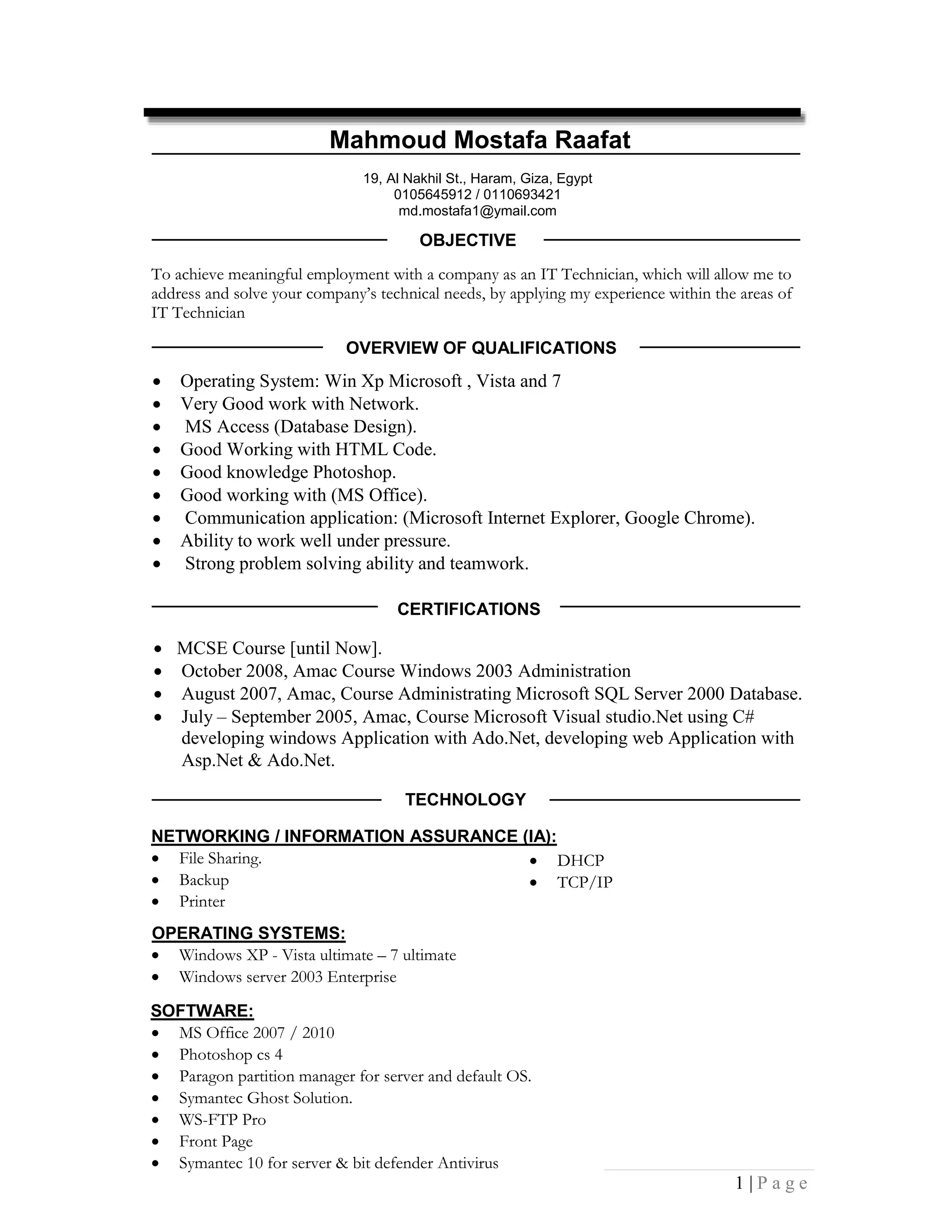 Mahmoud Mostafa Raafat is applying for an IT Technician position. He has over 15 years of experience in IT support including managing users on Windows servers, helping with hardware issues, and administering websites. His qualifications include Microsoft certifications and experience with Windows, networking, software like Office and Photoshop, and databases. He is seeking a role where he can apply his technical skills and experience solving IT problems for a company.