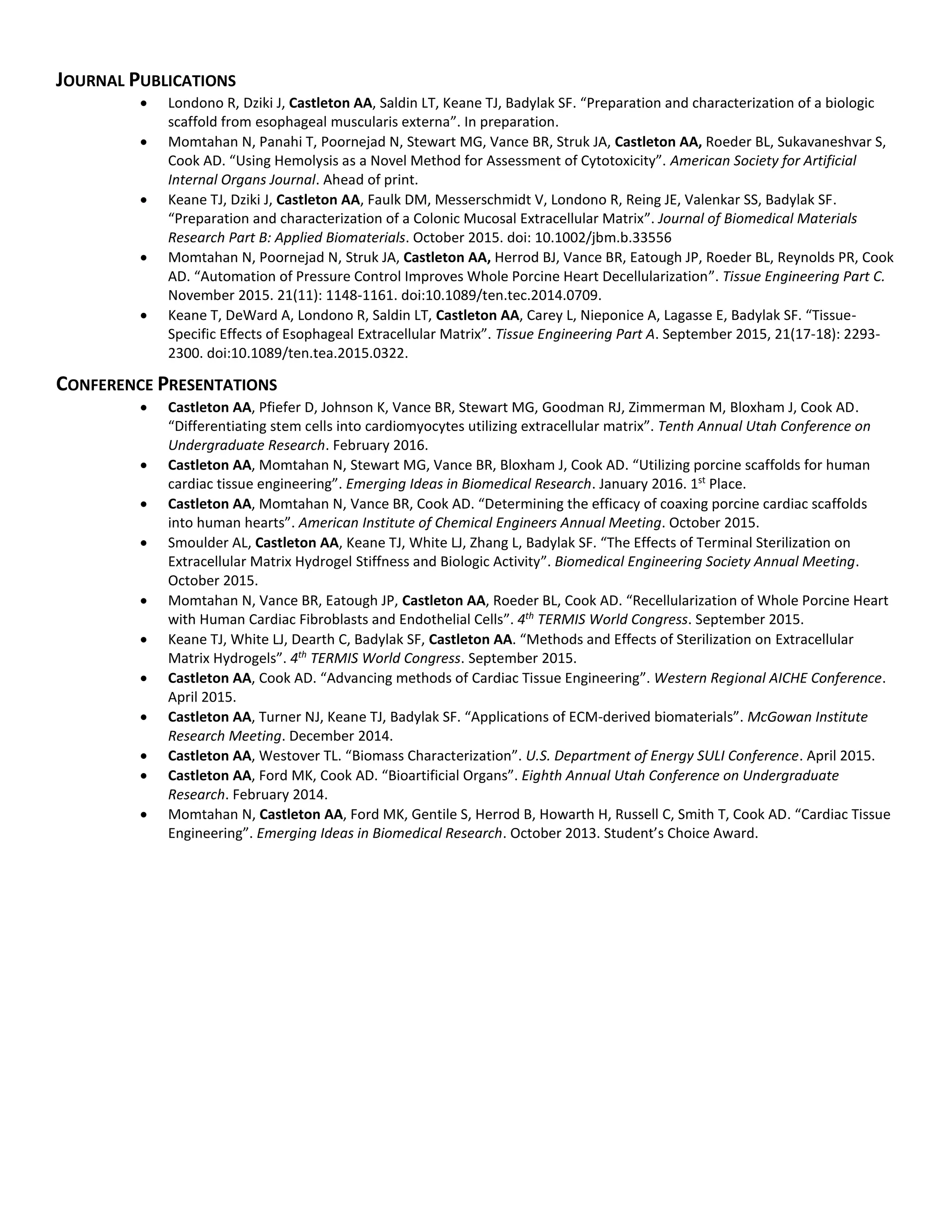 Arthur Castleton has extensive experience in biomedical research and tissue engineering. He has worked on projects involving stem cell culture, biomaterial characterization, and the development of biomedical devices. As an undergraduate, he has published journal articles, presented at numerous conferences, and mentored other students in the laboratory. Upon graduation from Brigham Young University, Castleton will receive a Bachelor of Science in Chemical Engineering.