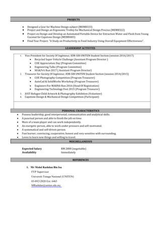 Parvathi a/p Venkatachalam holds a Bachelor of Engineering in Mechanical Engineering from Universiti Tenaga Nasional with a CGPA of 3.57 and has completed an industrial internship at Globe Engineering Sdn Bhd. She possesses skills in language, including Malay, English, and Tamil, as well as proficiency in various computer programs, and has participated in multiple projects and leadership activities. Currently 25 years old, she has excellent health, is single, and is available for work immediately, expecting a negotiable salary of RM 2800.