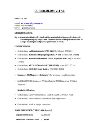 Prasath has over 10 years of experience as an inspection engineer, with certifications in welding inspection, pressure vessel inspection, NDT testing, and safety. He has worked on shutdown and turnaround projects in Singapore, Saudi Arabia, India, and Myanmar for companies in the oil, gas, and petrochemical industries. The CV lists his responsibilities as an inspection engineer, which include performing inspections, reviewing inspection reports, identifying defects, and ensuring repairs meet integrity standards.