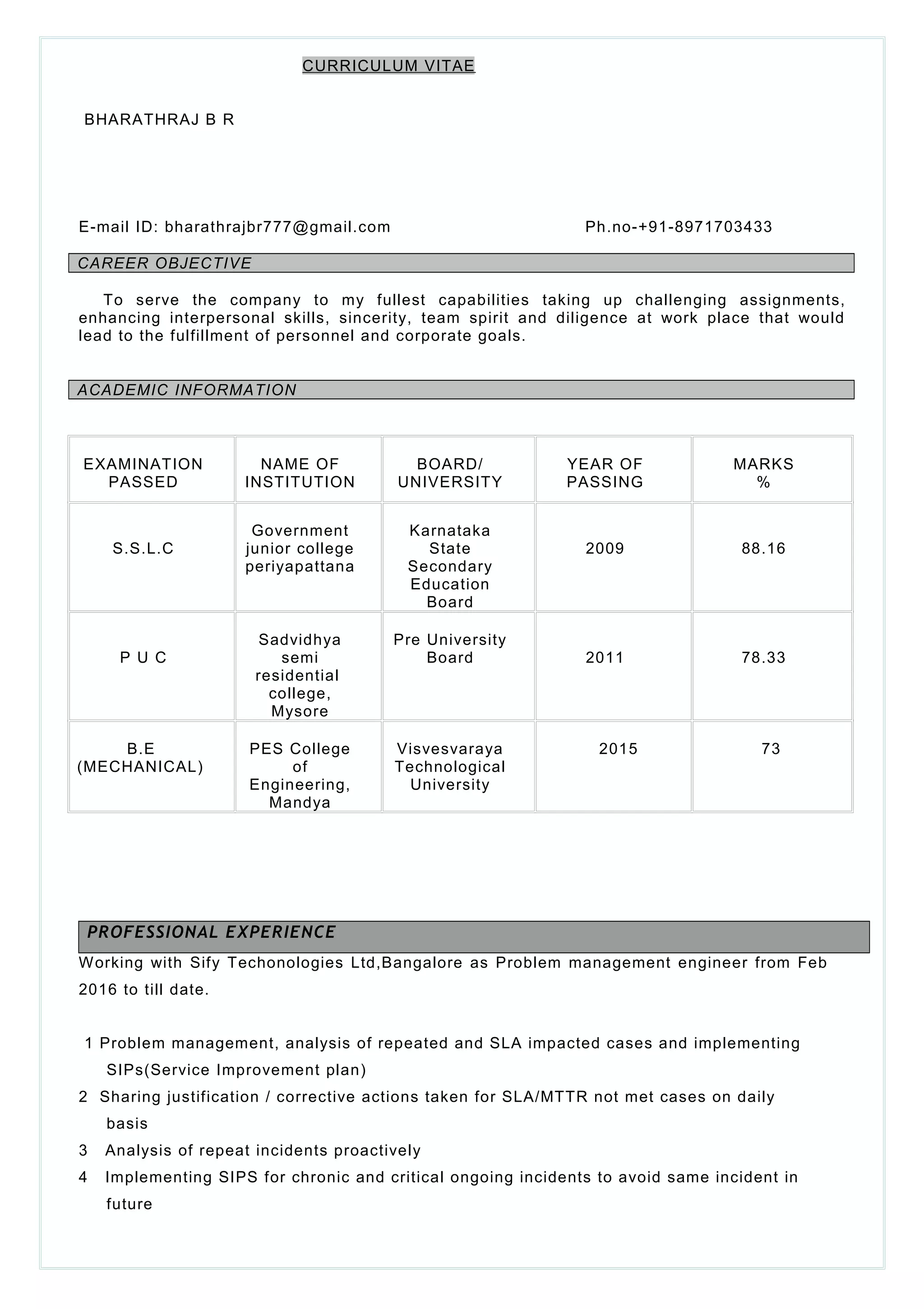 This curriculum vitae provides details about Bharathraj B R, including his contact information, career objective, academic qualifications, professional experience, projects, and personal details. Some key points include: