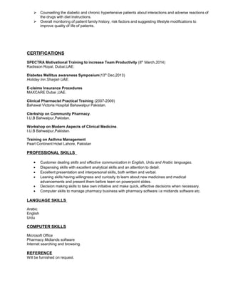 This document contains the resume of Qamar Mustafa, a pharmacist currently working in Abu Dhabi, UAE. It outlines his educational qualifications including a Doctor of Pharmacy degree, licenses, professional experience working in pharmacies in Dubai, UAE and Pakistan, responsibilities in those roles, certifications, skills, and languages spoken.