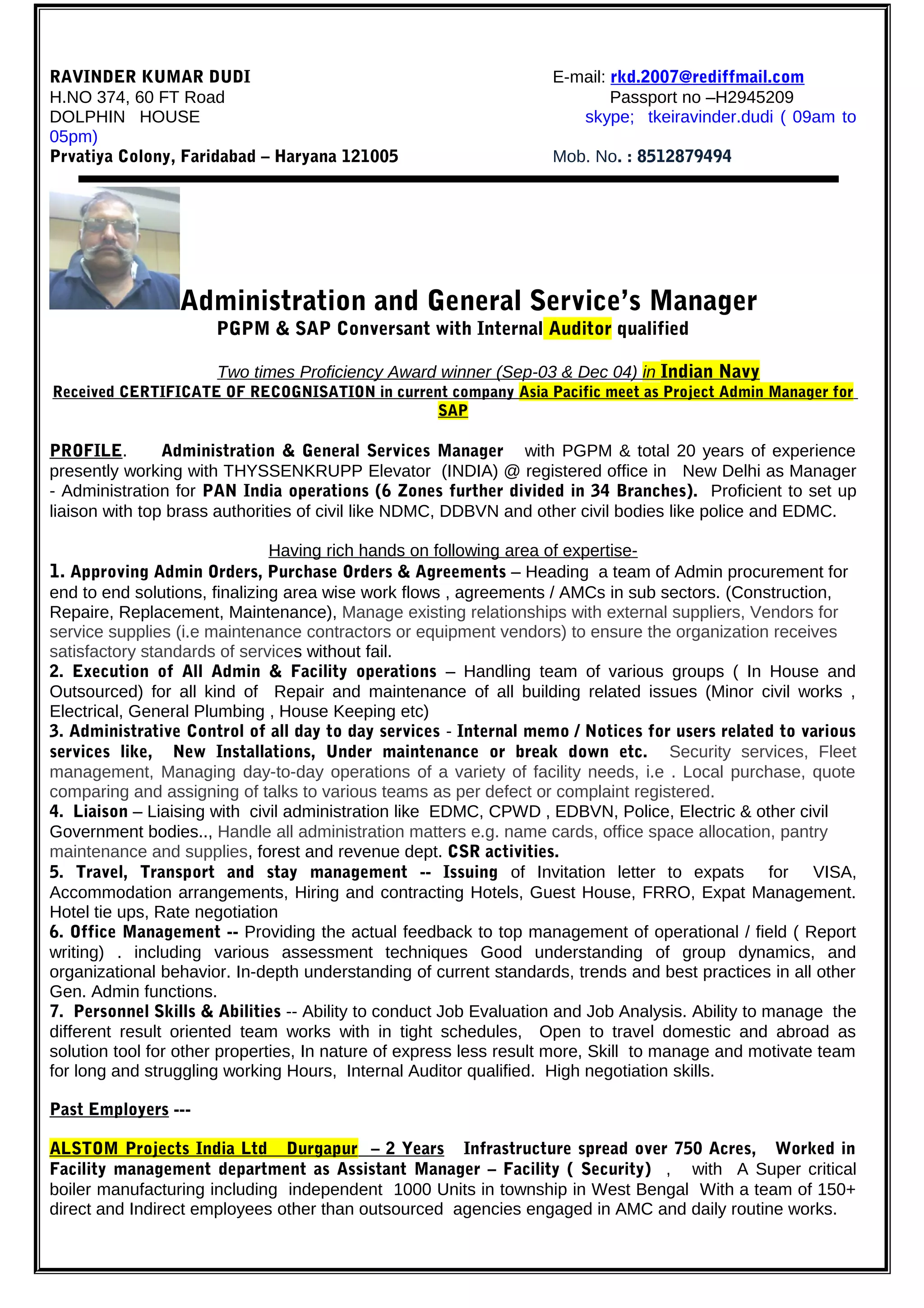 Ravinder Kumar Dudi has over 20 years of experience in administration and general services management. He is currently working as the Manager - Administration for Thyssenkrupp Elevator (India) Pvt. Ltd., overseeing administrative operations across 6 zones and 34 branches in India. Some of his key responsibilities include approving purchase orders and agreements, executing facility operations and maintenance, liaising with government bodies, travel and accommodation management, office management, and personnel management. Previously he worked for 15 years in the Indian Navy and also held positions with Alstom Projects India Ltd and Superwell Group in facilities and operations management.