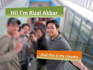 This document introduces Rizal Akbar and provides details about his background and experience. Rizal grew up in Depok, Indonesia and currently works in marketing at PT.Profesional Ekosistem Indonesia. In previous jobs, he has worked as both a technical staff member and manager on projects involving coding, animation, design, and video editing. He has built several web and mobile applications alone and with teams. The document discusses Rizal's observations about future trends in technology focusing on mobile devices and the internet. It concludes by providing Rizal's contact information.