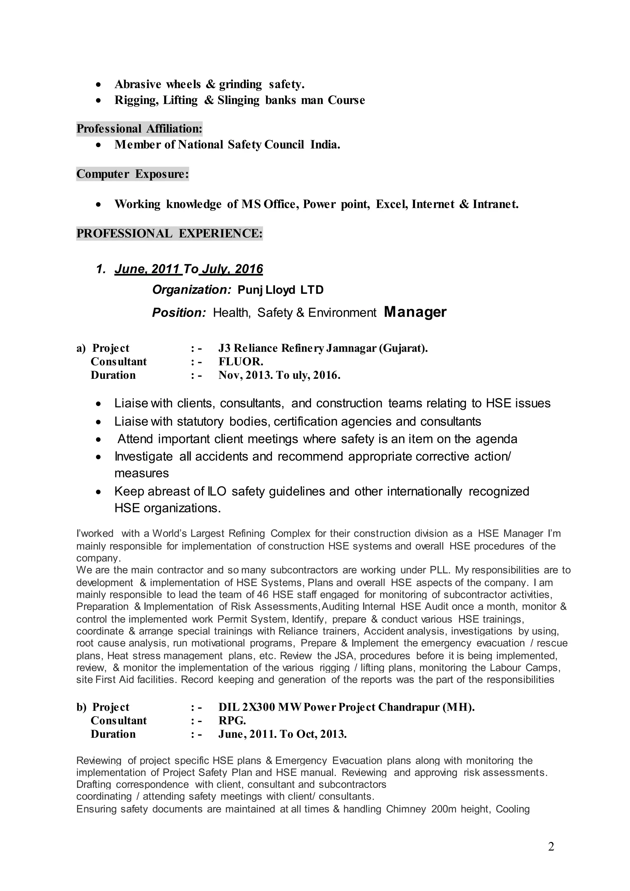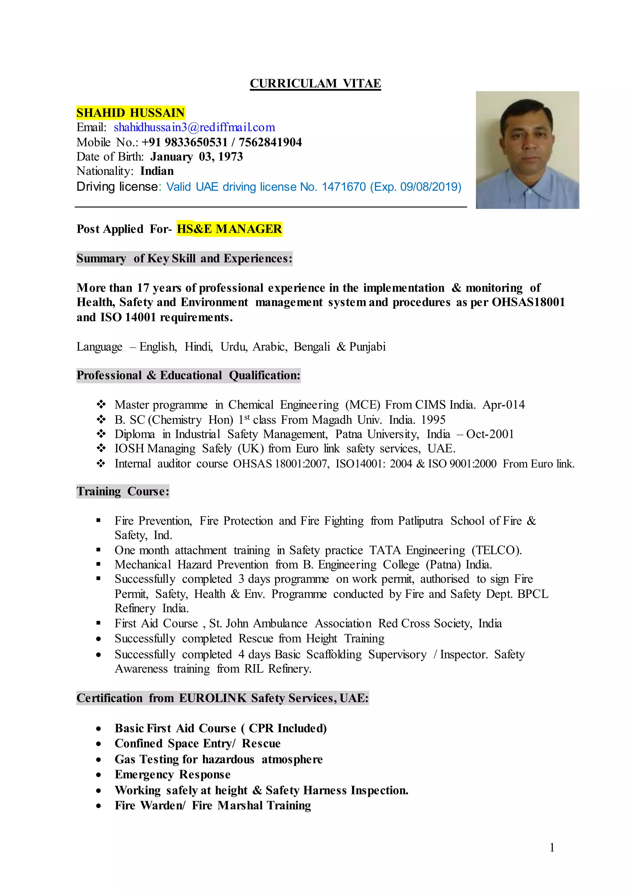 Shahid Hussain is an experienced health, safety, and environment manager with over 17 years in the field, skilled in OHSAS 18001 and ISO 14001 standards. He holds a Master's in Chemical Engineering and has extensive training in safety management, making him proficient in multiple languages. His work history includes managing HSE operations for significant projects in India and the UAE, focusing on implementing safety systems, risk assessments, and training programs.