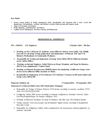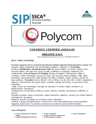 This document provides a summary of Siddarth Kaul's professional experience and qualifications. He has over 5 years of experience in network operations, technical support, and troubleshooting for Cisco, Polycom, and Avaya voice and video solutions. His roles have included network engineer, UC engineer, and tier 3 support engineer. He is proficient in technologies such as Microsoft Lync, Skype for Business, and Polycom RealPresence.