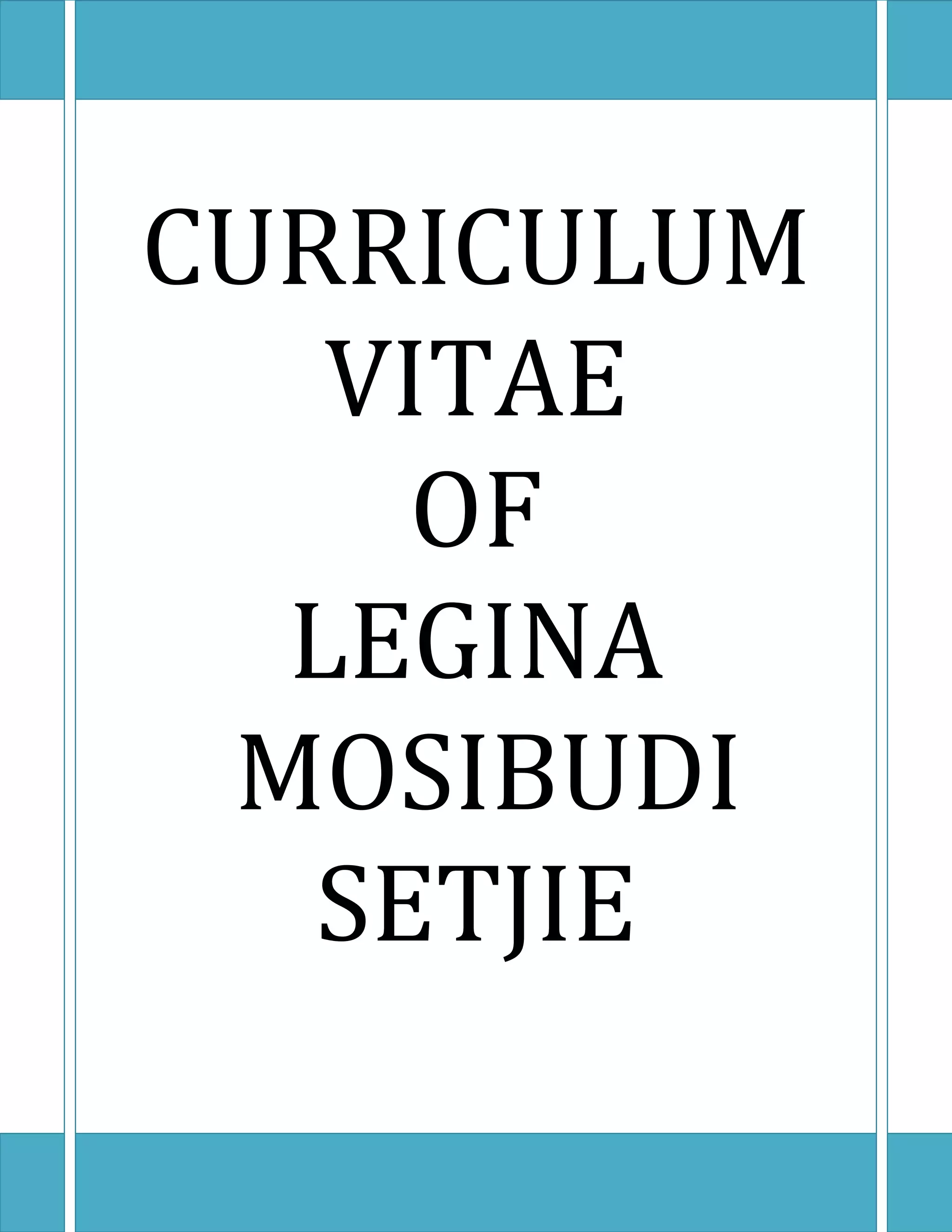 This curriculum vitae is for Legina Mosibudi Setjie, a 21-year-old South African female. She completed her grade 12 education in 2013 at Mmantshako Secondary School, majoring in mathematics, physical science, life sciences, economics, English and Sepedi. In 2014-2015, she completed a Management Assistant course at Senwabarwana Campus, studying office practice, communication, information processing, and computer practice. Currently, she works as a receptionist at Senwabarwana Campus, where her responsibilities include receiving calls, visitors, data entry, switchboard maintenance, and administrative tasks like filing and photocopying.