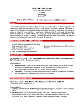 Malcolm Drummond is an experienced supervisor and retail manager seeking a new role. He has over 16 years of experience supporting and developing teams. He is skilled in areas such as administration, IT, customer service, and health and safety compliance. Drummond has qualifications in human resources, business, bookkeeping, and management. He is looking for an opportunity that rewards hard work and allows career growth.