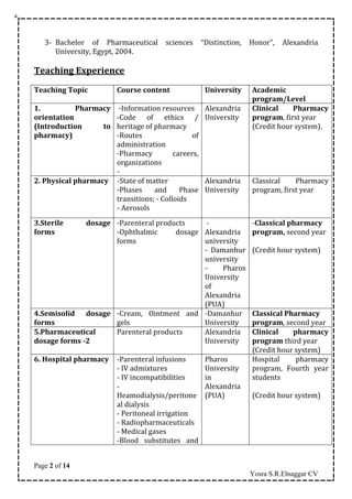This document is a curriculum vitae for Yosra S.R. Elnaggar that includes her personal details, work experience, education, teaching experience, industrial trainings, language qualifications, awards, author nominations, special career development training courses, and community/student services. She is an Associate Professor of Pharmaceutics with over 10 years of teaching experience at Alexandria University and Pharos University in Alexandria. Her research focuses on developing new drug delivery systems using nanotechnology.
