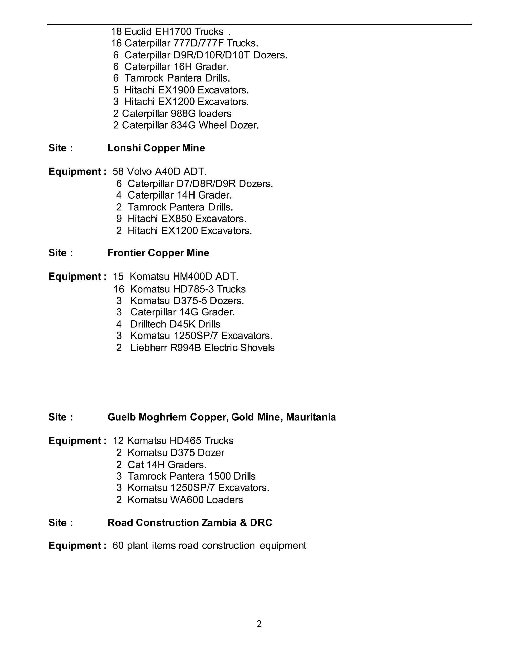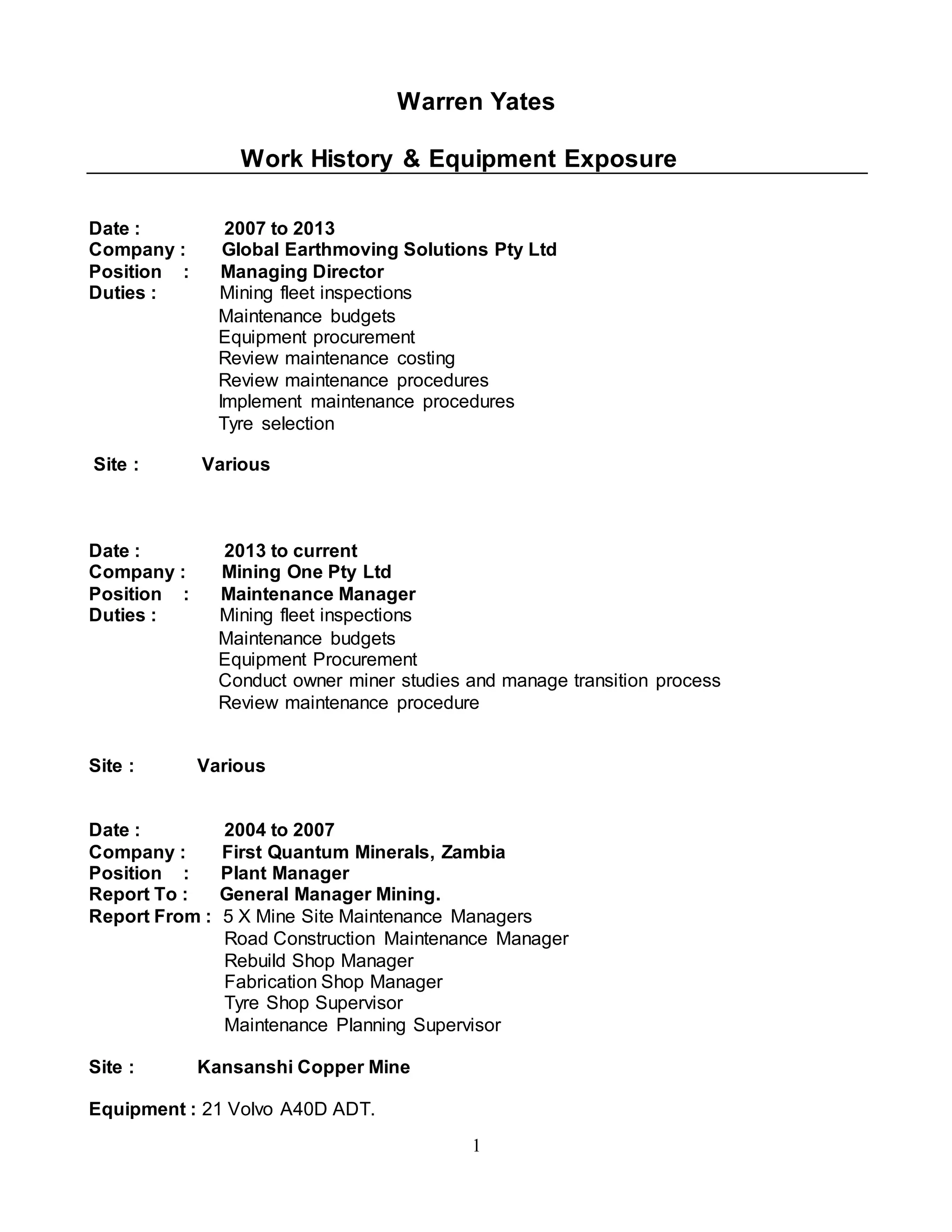 This document provides a summary of Warren Yates' work history and experience working with various mining equipment. It details his roles as Managing Director at Global Earthmoving Solutions from 2007-2013, Maintenance Manager at Mining One since 2013, and Plant Manager at First Quantum Minerals in Zambia from 2004-2007 where he oversaw maintenance operations at multiple mine sites. It also lists the various heavy equipment, such as haul trucks, dozers, graders and excavators, that he has experience working with and maintaining at each location.