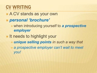 This document provides guidance on how to write a good CV. It recommends that a CV should be concise, accurate, truthful, and tailored to the specific position. Key sections to include are personal details, education and qualifications, work experience, interests and achievements, and references. Formatting tips include using a simple layout with headings and bullet points, as well as proofreading for errors. The document also provides examples of how to effectively describe experiences and skills using the STAR technique.
