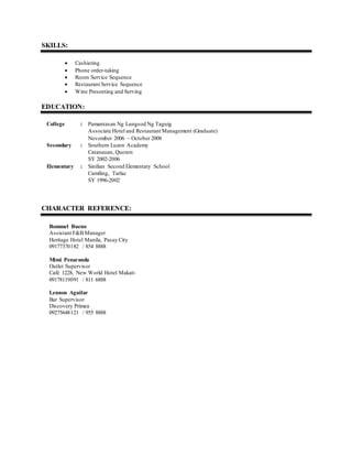 Neljon Parafina Maracha is a 26-year-old Filipino man currently working as a Captain Waiter at Discovery Primea in Makati City, where he is responsible for training subordinates and monitoring their performance. He has over 5 years of experience in various food and beverage roles, including as a room service waiter and outlet waiter. He lists his skills as cashiering, phone order-taking, room service sequencing, restaurant service sequencing, and wine presenting and serving.