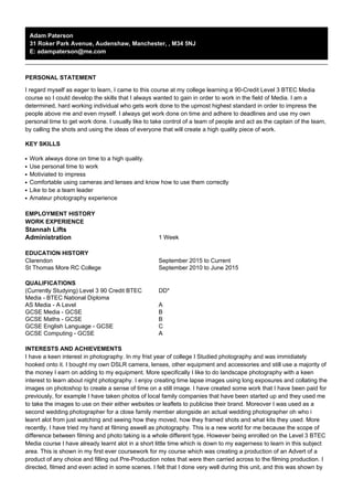 Adam Paterson is a hardworking and determined individual studying a Level 3 90-Credit BTEC Media course to develop skills for a career in media. He gets work done on time and to a high standard. He enjoys taking a leadership role on teams and likes to take control by calling the shots. He has experience in photography and filming and is eager to continue learning and improving his skills.