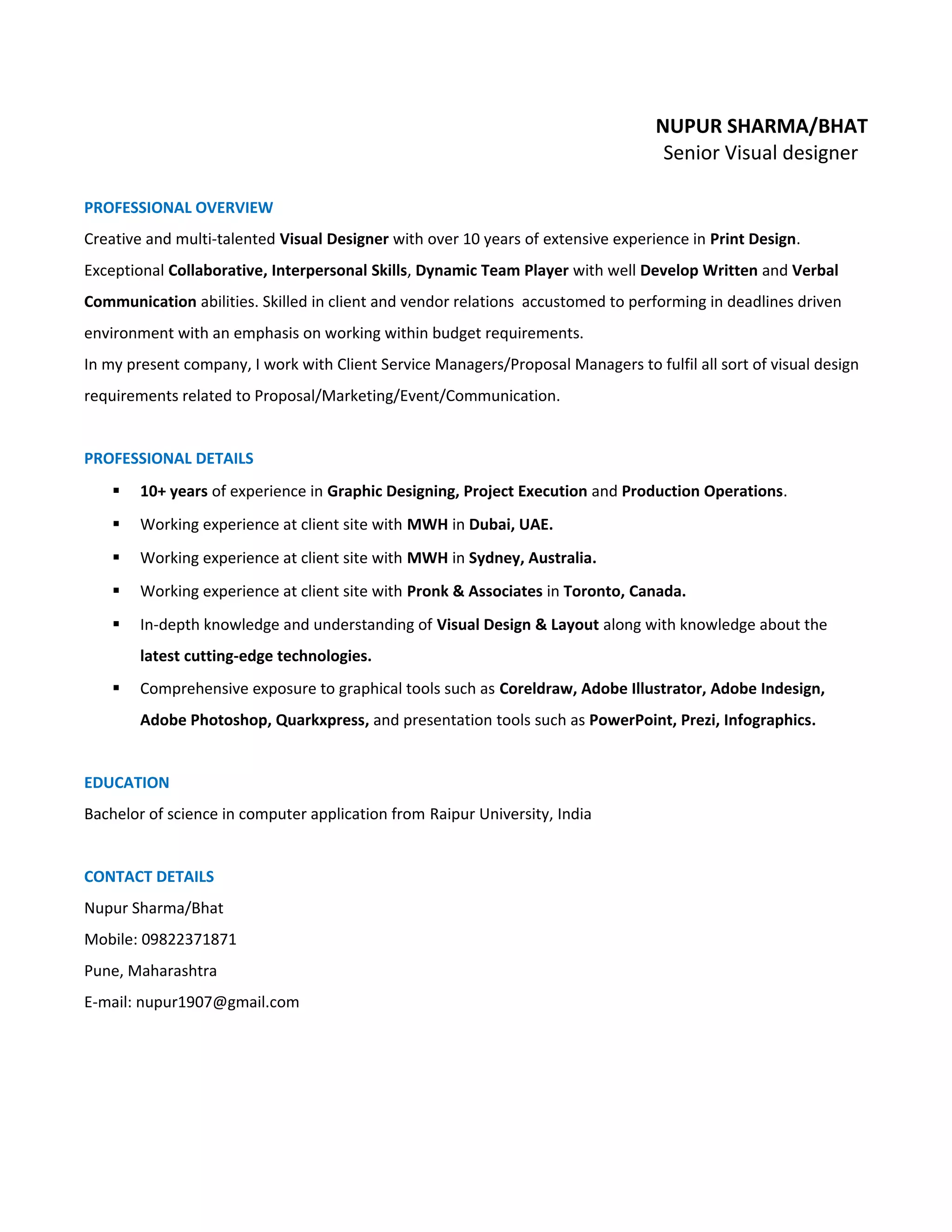 Nupur Sharma is a senior visual designer with over 10 years of experience in print design. She currently works for MWH in Pune as a visual designer, providing graphic design services for proposals, marketing, events, and communications. Prior to her current role, she held graphic design and project leadership positions with other companies, and has extensive experience using design software like Adobe Photoshop, Illustrator, and InDesign.