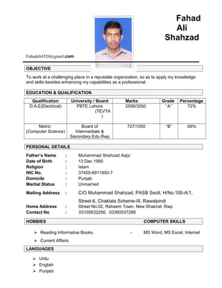 Fahad Ali Shahzad is seeking a challenging position in a reputable organization to apply his knowledge and skills. He has a D.A.E in Electrical from PBTE Lahore with 72% and a metric in Computer Science from Board of Intermediate & Secondary Edu Rwp with 69%. His personal details include his father's name, date of birth, religion, NIC number, domicile, marital status, mailing and home addresses, and contact numbers. His hobbies include reading informative books and current affairs. His computer skills include MS Word, MS Excel, and the Internet. He speaks Urdu, English, and Punjabi and can provide references upon request.