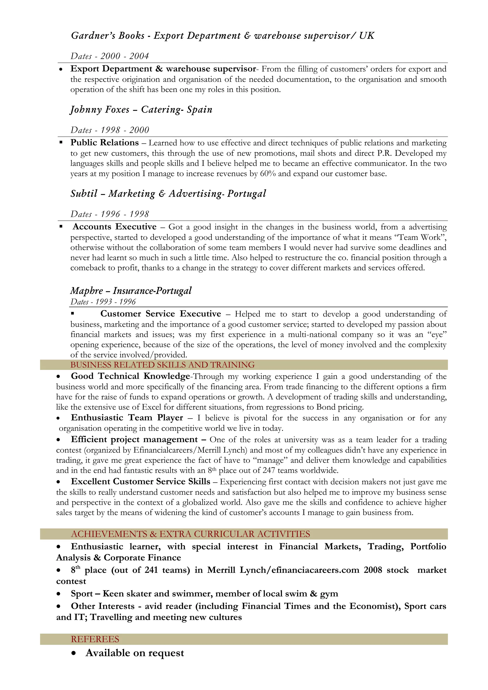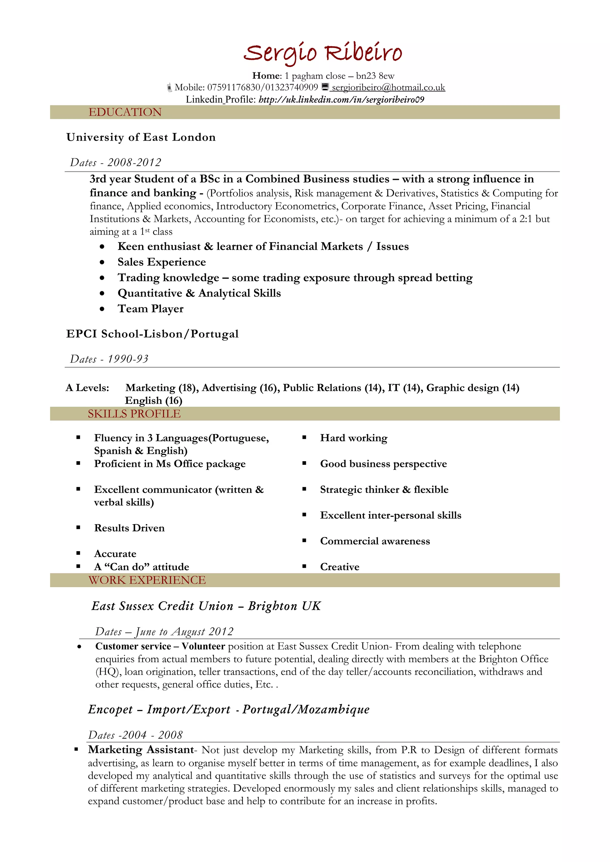 Sergio Ribeiro is a third-year BSc student in Business Studies at the University of East London, focusing on finance and banking, and aiming for a first class degree. He has diverse work experience in customer service, marketing, and export management across various countries, demonstrating strong communication and analytical skills, along with proficiency in multiple languages. Ribeiro has also achieved recognition in a global stock market contest and exhibits a keen interest in financial markets and trading.