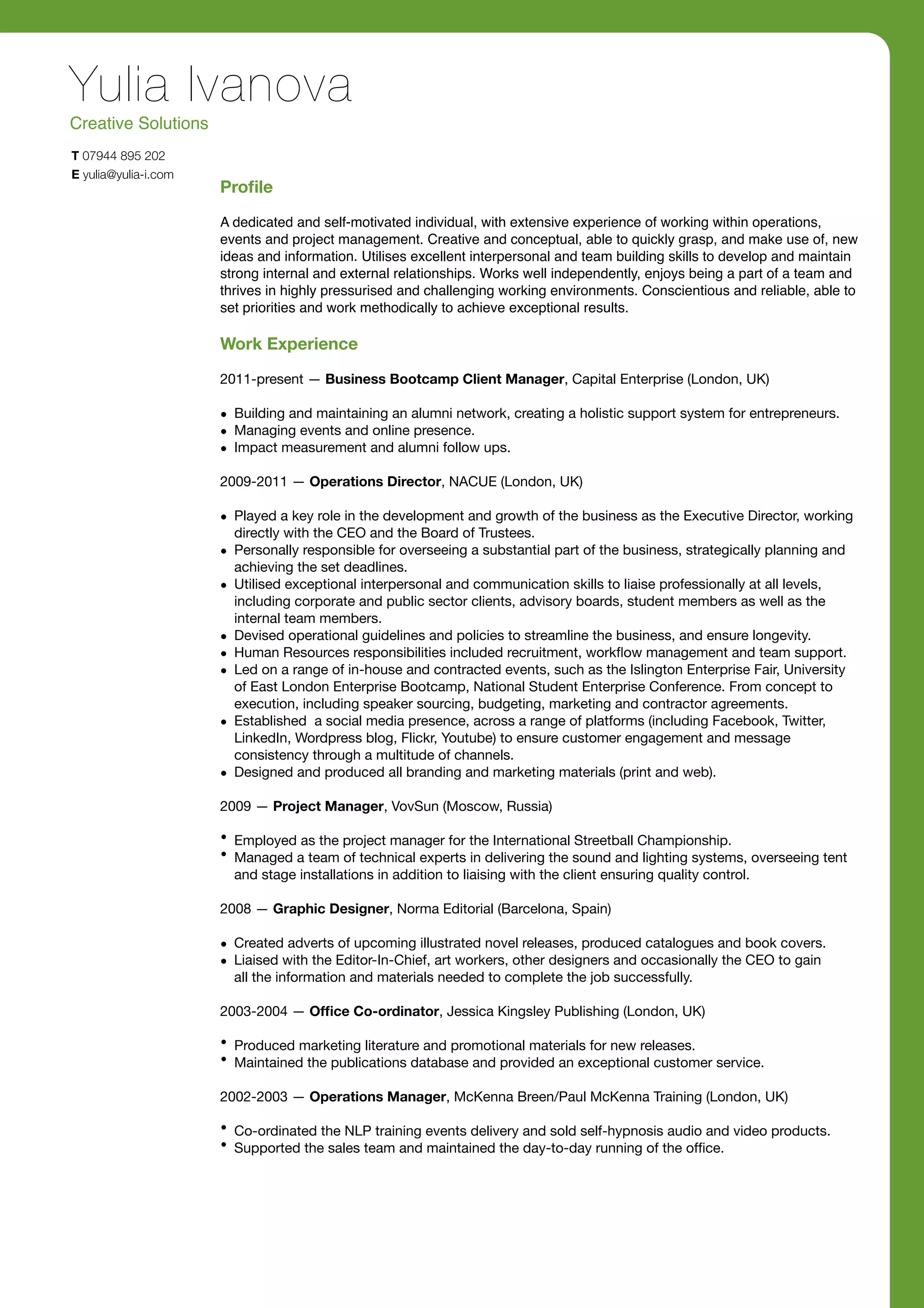 Yulia Ivanova has over 15 years of experience in operations, events, project management, and graphic design. She is currently a Client Manager at Capital Enterprise, where she builds alumni networks and manages events and their online presence. Previously she was Operations Director at NACUE, where she oversaw parts of the business, planned strategically, and ensured quality. She has a BA in Graphic Media Design and experience in graphic design, office coordination, and project management.