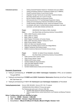 This document is a curriculum vitae for Prakasam Selvarasu, an electrical engineer from India. It summarizes his personal details, education, training experience, work history, professional experience, and qualifications. He has a bachelor's degree in electrical engineering and over 3 years of experience testing and commissioning high voltage substations in the UAE and India. He is proficient in testing various types of protection relays and switchgear equipment.