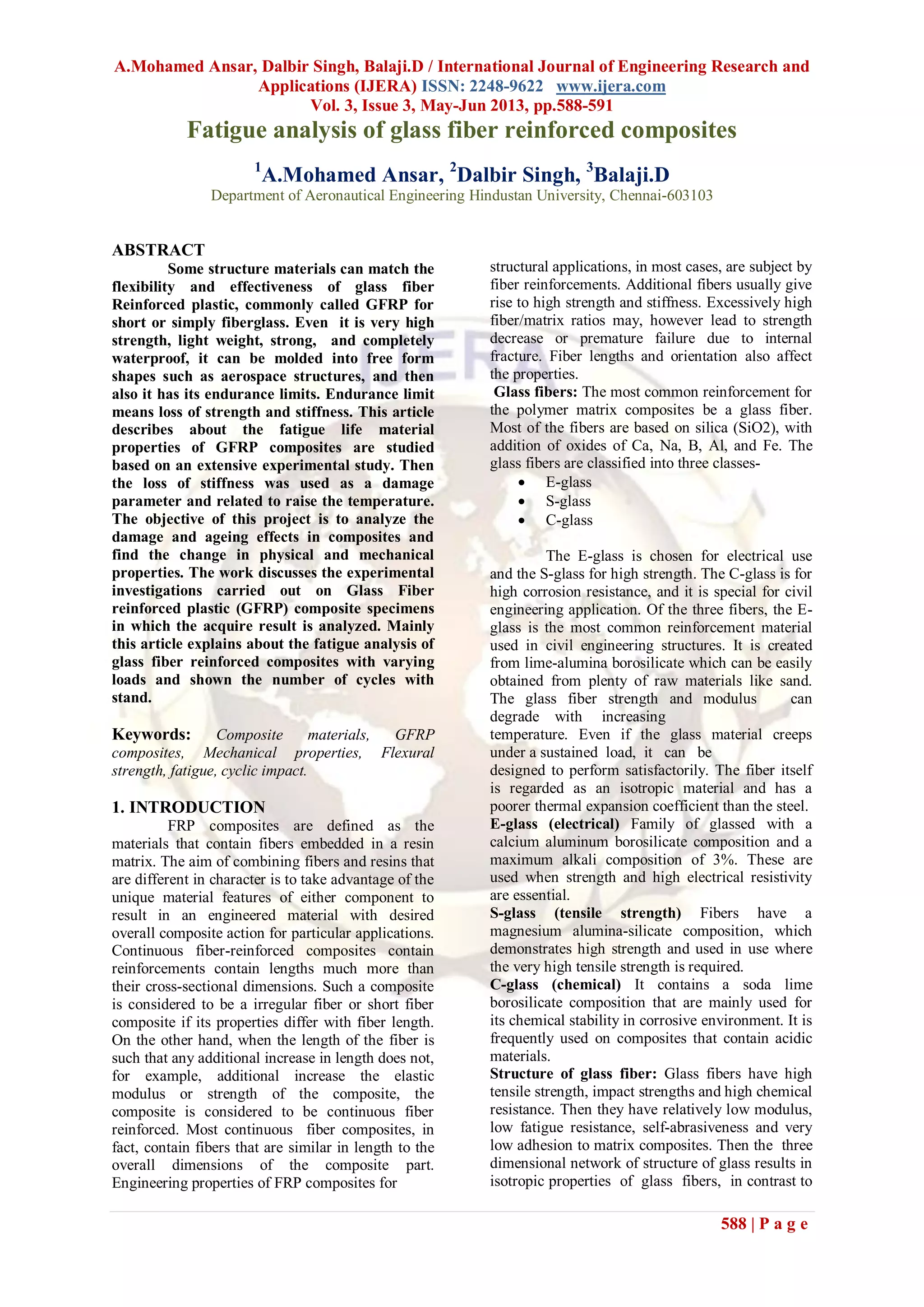 This document discusses a study on the fatigue analysis of glass fiber reinforced composites. It describes how glass fiber reinforced epoxy laminate composite samples were manufactured using vacuum bagging technique. The samples were then cut and tested under varying cyclic loads on a fatigue testing machine. The results showed that the glass fiber reinforced composites could withstand fatigue loads efficiently compared to aluminum and the number of cycles before failure decreased as the applied load increased. The document concludes that future work could extend these tests under different loading conditions to improve stress variation understanding and enable application in aircraft structures.