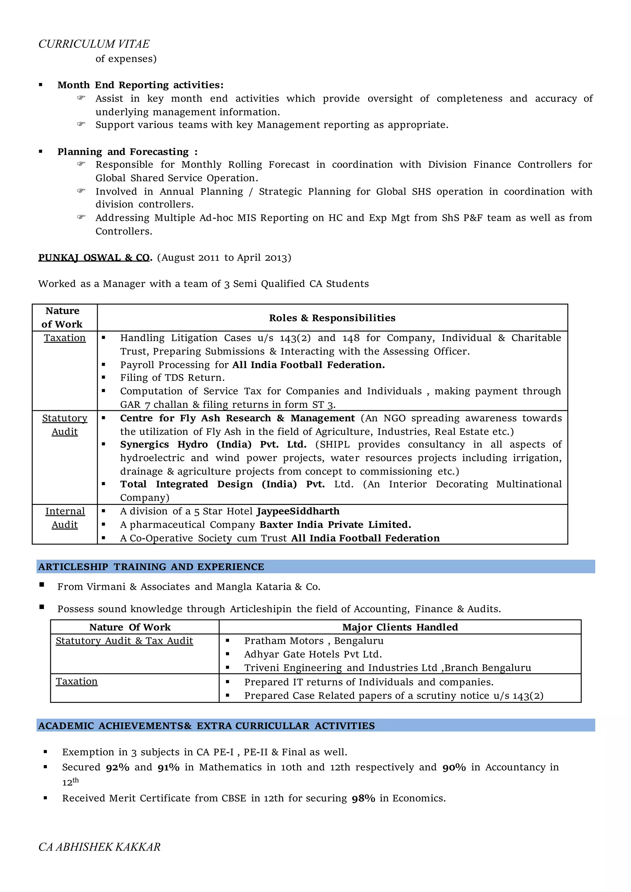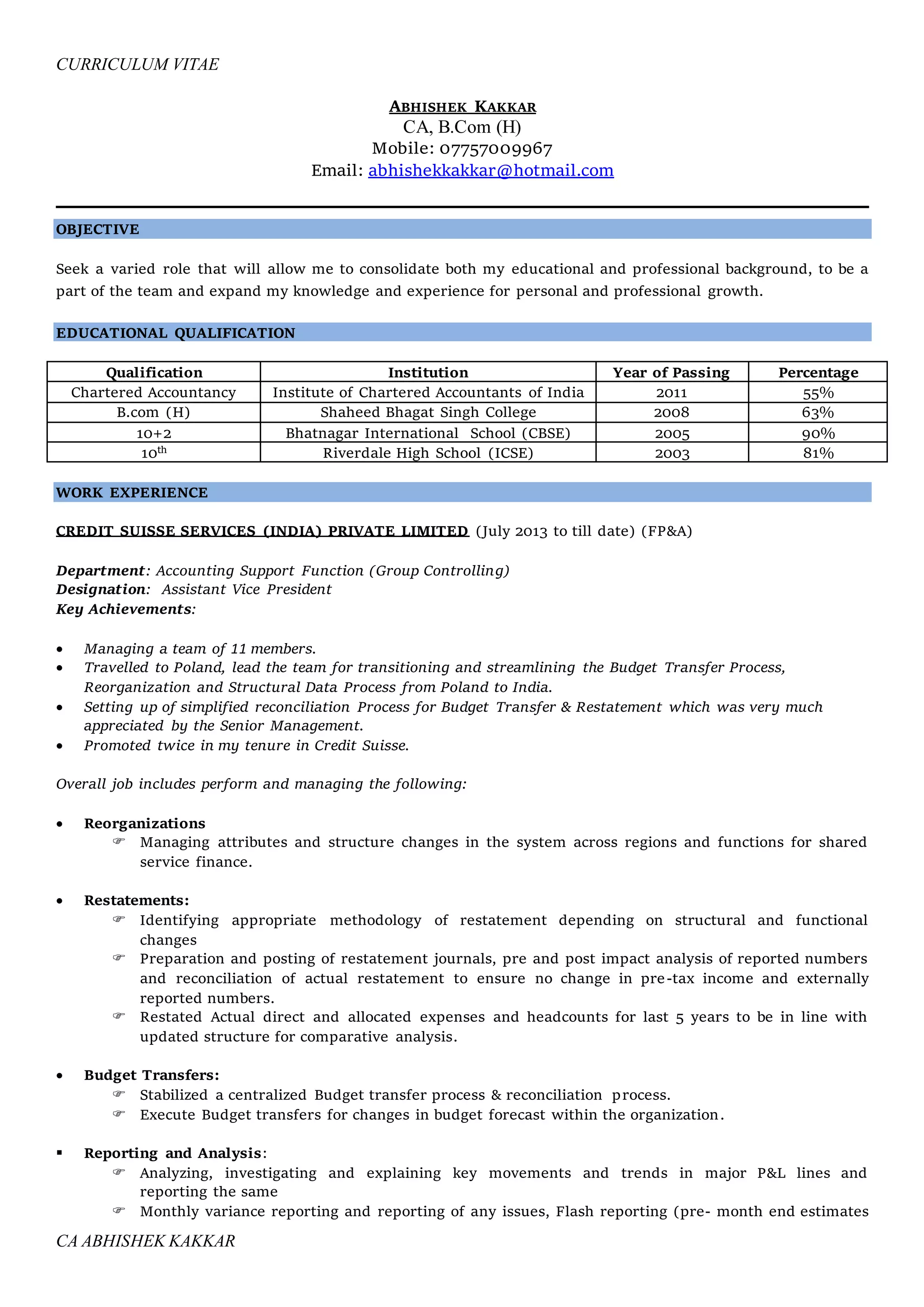 Abhishek Kakkar is a Chartered Accountant with over 10 years of experience. He currently works as an Assistant Vice President at Credit Suisse Services (India) Private Limited, where he manages a team of 11 members and leads the budget transfer and reorganization process. Previously, he worked as a Manager at Punkaj Oswal & Co, handling taxation, statutory audits, and internal audits for various clients. He holds a B.Com degree and is proficient in accounting software like Tally ERP, Essbase, and PeopleSoft.