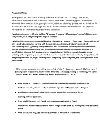 Ahmed Abdelmohsen Elsayed Madkour is a civil engineer from Alexandria, Egypt with over 6 years of experience. He has worked on various construction projects in Dubai, Egypt, Saudi Arabia, and elsewhere. His experience includes managing residential building projects from start to finish, including coordinating subcontractors, ensuring quality control, and obtaining necessary approvals and certificates. He has a bachelor's degree in civil engineering and qualifications in engineering software, project management, safety, and English.