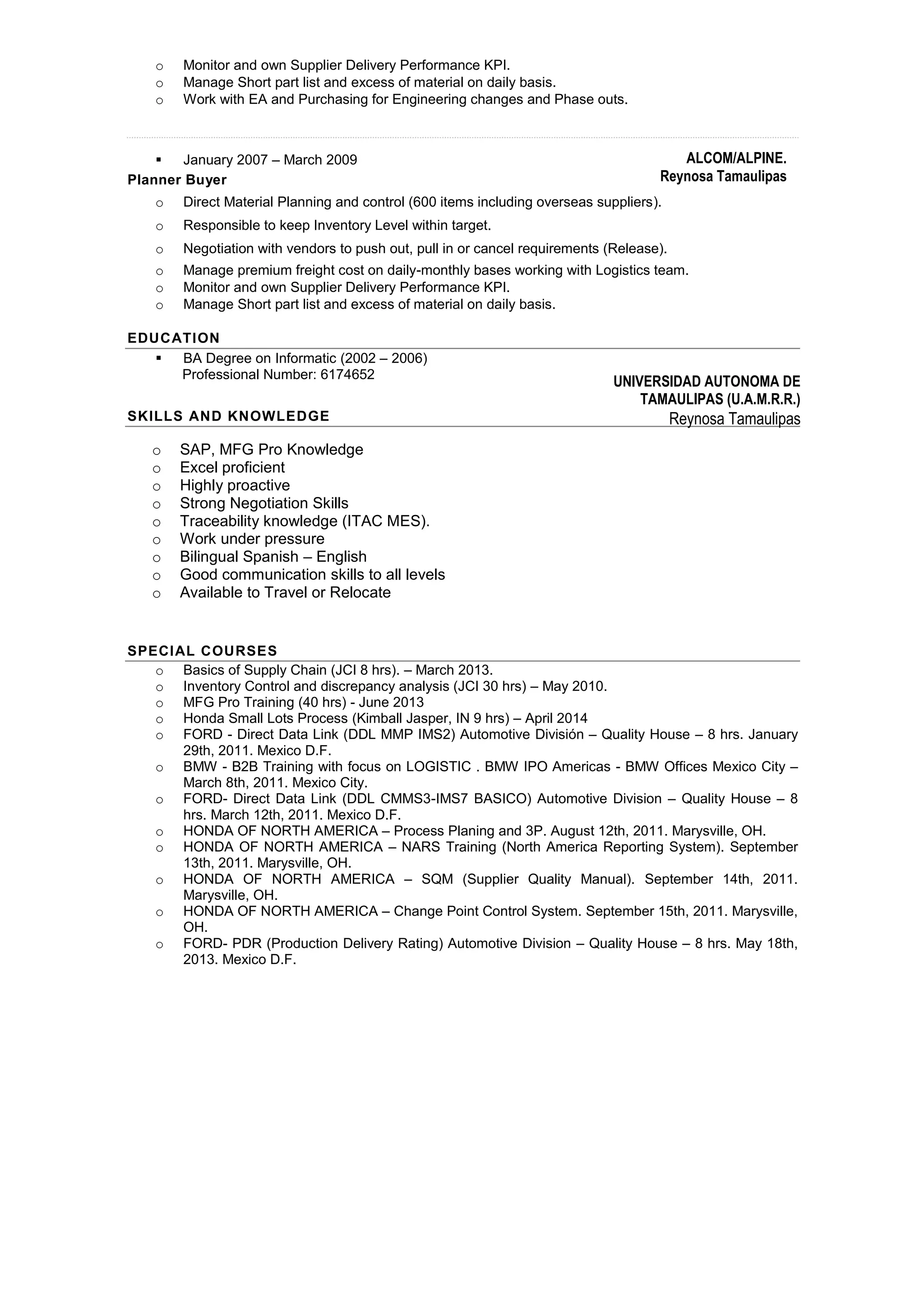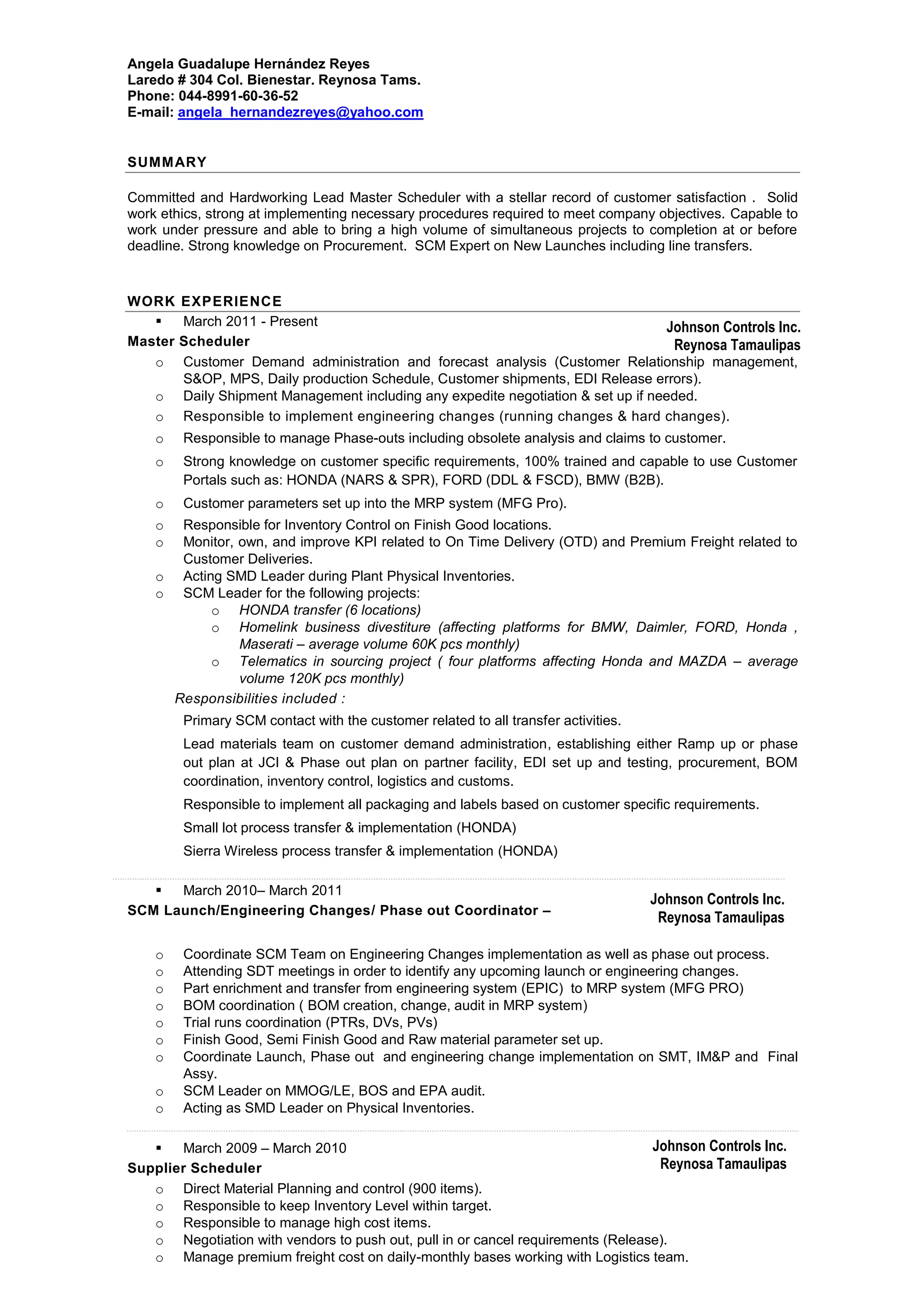 Committed and hardworking lead master scheduler with over 10 years of experience in supply chain management, procurement, and customer relationship roles. Extensive knowledge of customer relationship management systems, production planning, inventory control, and implementing engineering changes. Proven track record of successfully managing high-volume projects and meeting tight deadlines.
