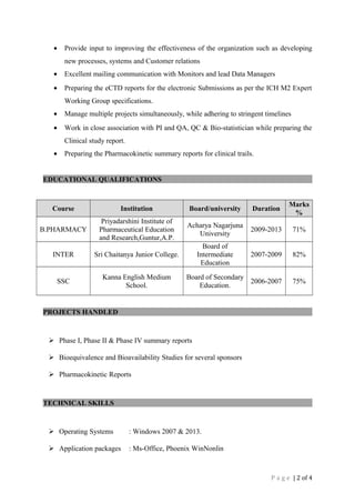 Ashok Kota is seeking a position in data management and regulatory writing. He has over 1 year of experience in data management, preparing study reports, and eCTD submissions. He is currently working as an Associate Data Manager at Piramal Clinical Research in Hyderabad, where his responsibilities include data entry, validation, query handling, report writing, and ensuring high-quality standards are met. He has a B.Pharmacy degree from Priyadarshini Institute of Pharmaceutical Education and holds skills in MS Office, data management software, and regulatory writing.
