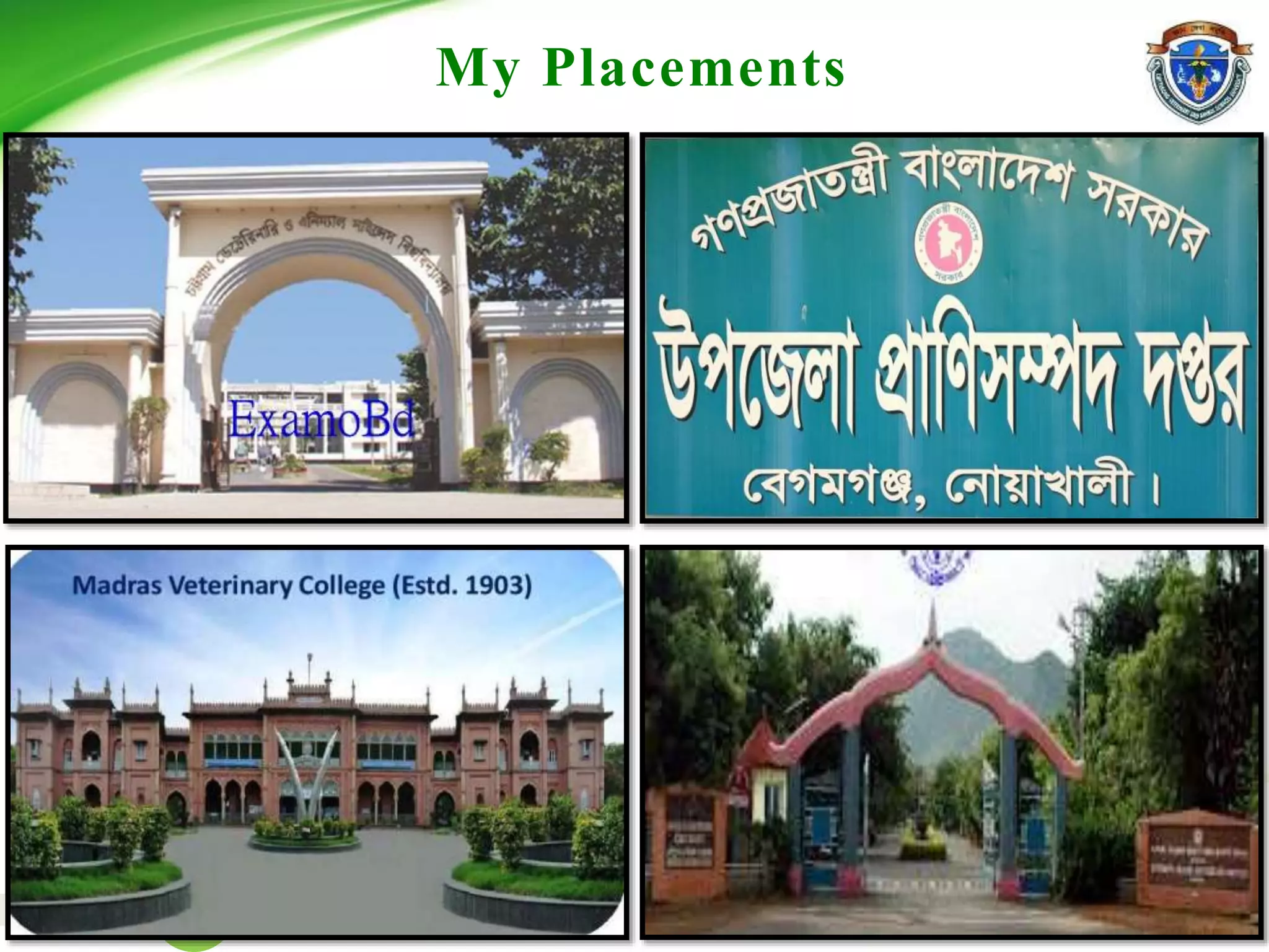 This document provides details about Mishuk Shaha's placements and activities during veterinary college from 2017-2018. It includes a list of his placements at various veterinary hospitals and colleges from February 2017 to May 2018. The document then describes his activities and duties during each placement, including laboratory tests, clinical cases, farm visits and more. It concludes by thanking all those involved in his placements.