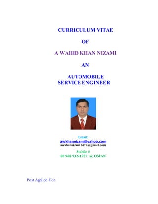 Awdul Wahid Khan Nizami has over 16 years of experience in the automobile service sector. He currently works as a Senior Service Engineer in Oman, managing a large automotive workshop that services over 800 vehicles per day. Previously, he held service management roles in India, such as Service Manager and Workshop Supervisor. He aims to take on a senior managerial position with an reputable automotive organization.