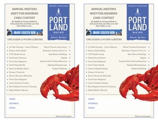 This document appears to be a card for a meet-the-members event hosted by an organization. The card lists various exhibitors and sponsors including media groups, tourism associations, and businesses. Attendees can get their card punched at exhibitor tables to enter a contest to win one dozen 1.5 pound lobsters. The winner must be present to claim the prize.
