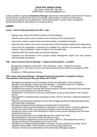 Carol Ann Hamer-Jones has over 30 years of experience in financial services operations management. She is currently the Head of Sales Operations at Lextox, where she manages an 85 person team and focuses on sales growth, customer retention, and process improvement. Previously, she held several senior operations and customer service management roles at TSB and Lloyds Banking Group, where she delivered business transformations, improved performance metrics, and implemented training programs. She has a proven track record of successful leadership, optimization of processes, and achievement of targets.