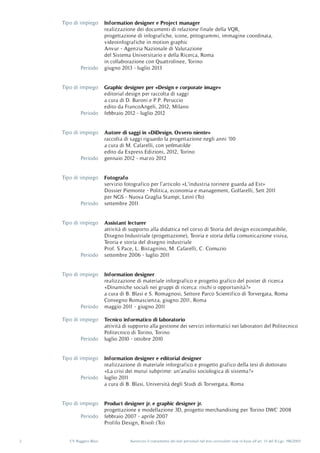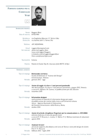Il documento è un curriculum vitae di Ruggero Blasi, un professional nel campo del design e della comunicazione visiva, con esperienza accademica e lavorativa in diverse istituzioni e progetti. Ha conseguito un dottorato in scienze del design, e vanta competenze linguistiche e tecniche in vari strumenti di design e progettazione. Include anche autorizzazioni per il trattamento dei dati personali secondo la normativa vigente.