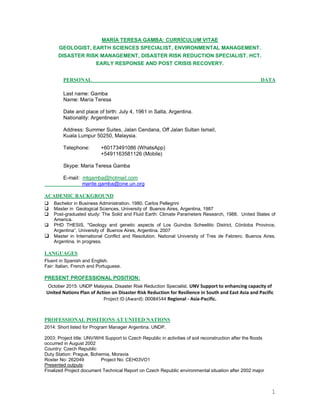 This document provides a curriculum vitae for María Teresa Gamba, an environmental geologist and disaster risk management specialist working for the United Nations. It outlines her educational background which includes degrees in business administration, geological sciences, and international conflict resolution. It also details her extensive professional experience working on projects in several countries related to mining, the oil and gas industry, environmental management, and disaster risk reduction.